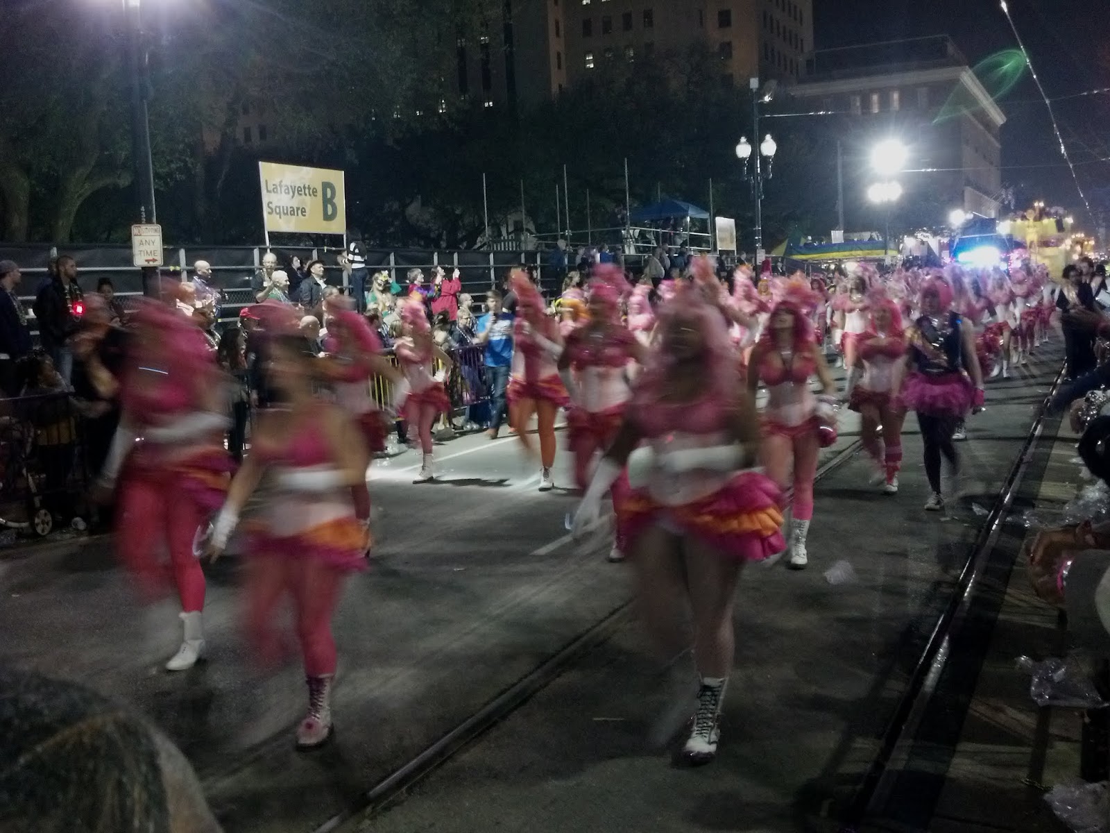 These people are carrying fire lights using kerosene or propane. Many years ago the floats where not lit up and no street lights. People had these lights so you could see. These people were not paid except for tips, they were usually the very poor people of the area and were not dressed very well.